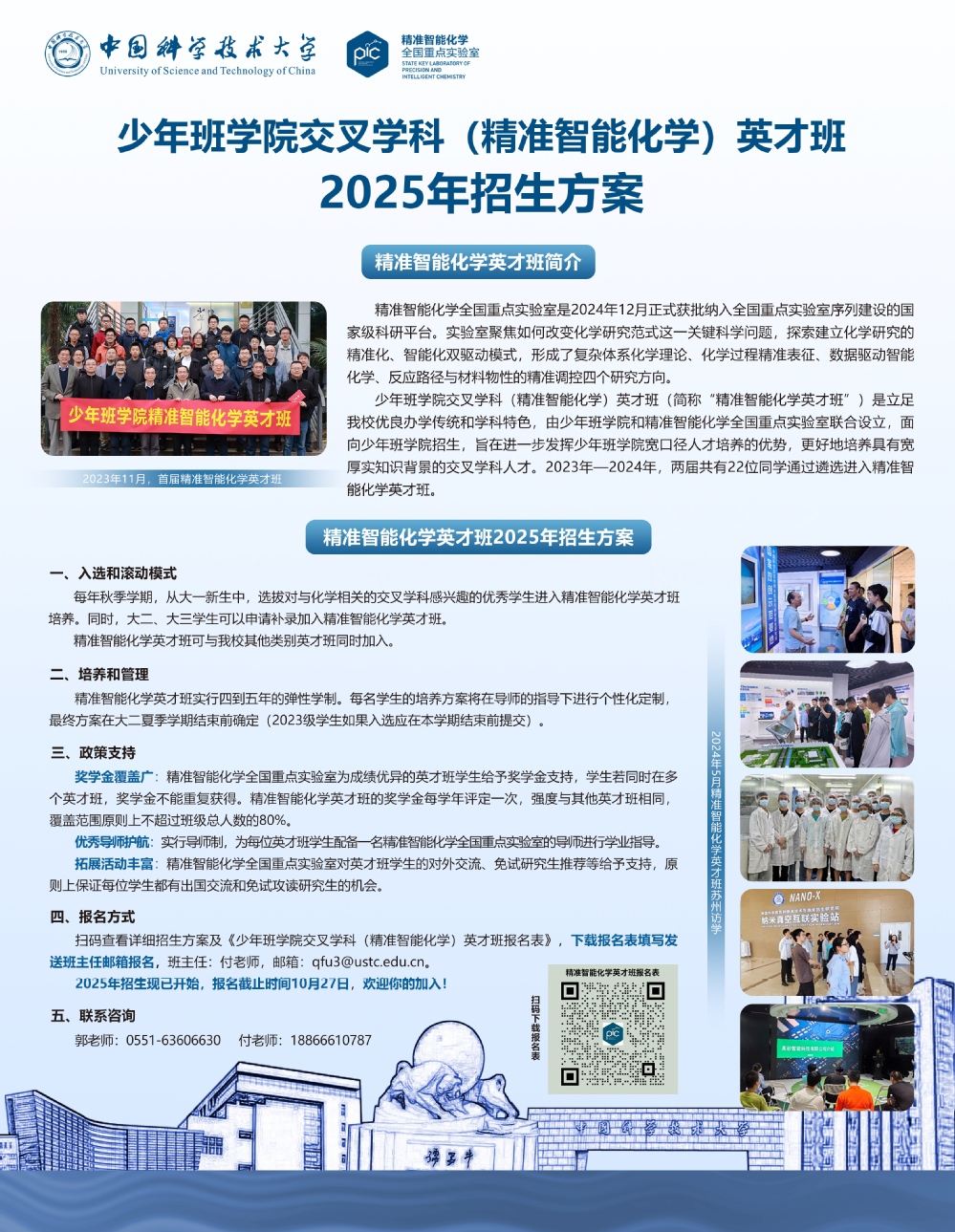 少年班学院交叉学科(精准智能化学)英才班(简称“精准智能化学英才班”)是立足我校优良办学传统和学科特色,由少年班学院和精准智能化学全国重点实验室联合设立,面向少年班学院招生,旨在进一步发挥少年班学院宽口径人才培养的优势,更好地培养具有宽厚实知识背景的交叉学科人才。2023年—2024年,两届共有22位同学通过遴选进入精准智能化学英才班。