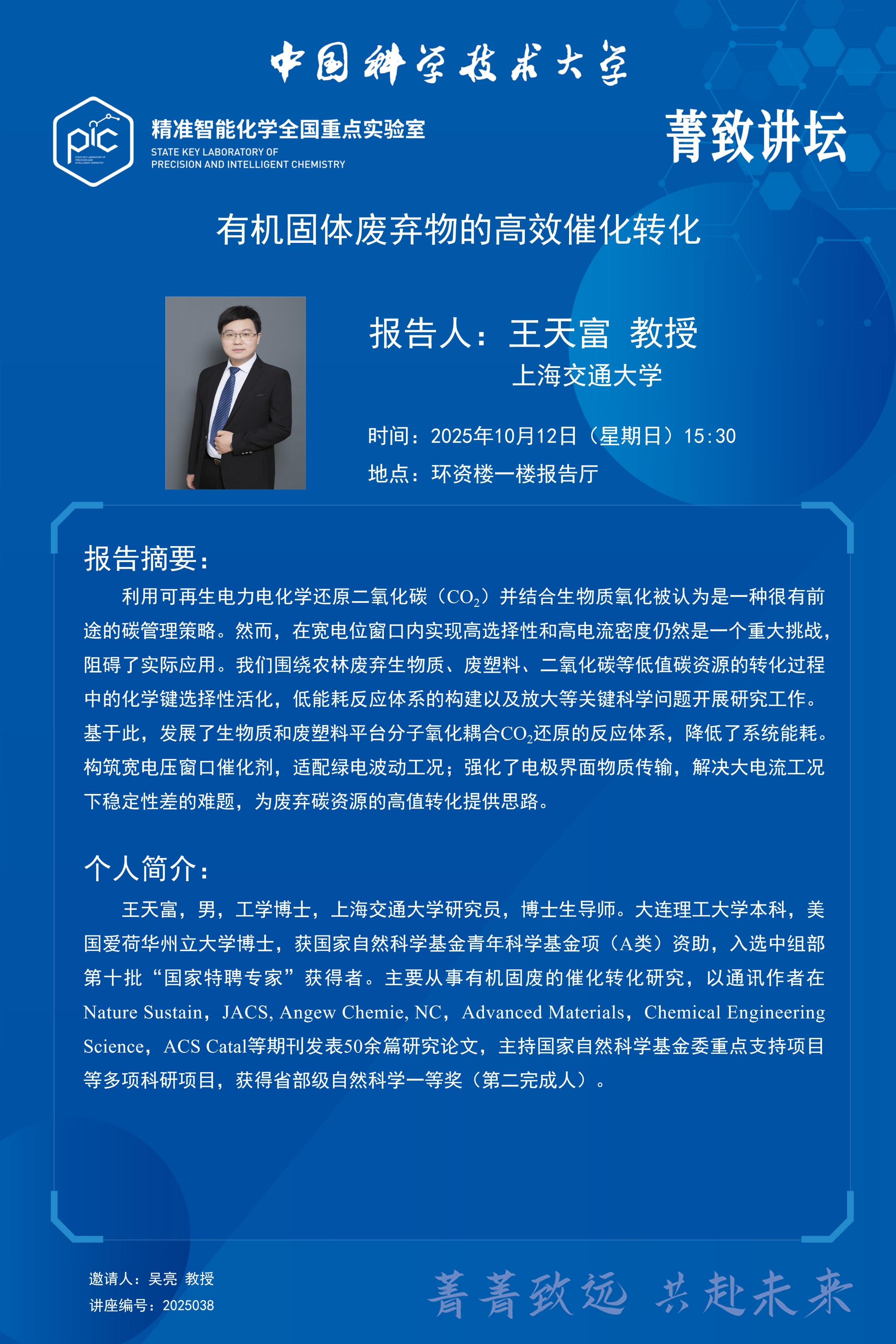 报告人简介 | 王天富,男,工学博士,上海交通大学研究员,博士生导师。大连理工大学本科,美国爱荷华州立大学博士,获国家自然科学基金青年科学基金项(A类)资助,入选中组部第十批“国家特聘专家”获得者。主要从事有机固废的催化转化研究,以通讯作者在Nature Sustain,JACS, Angew Chemie, NC,Advanced Materials,Chemical Engineering Science,ACS Catal等期刊发表50余篇研究论文,主持国家自然科学基金委重点支持项目等多项科研项目,获得省部级自然科学一等奖(第二完成人)。 |