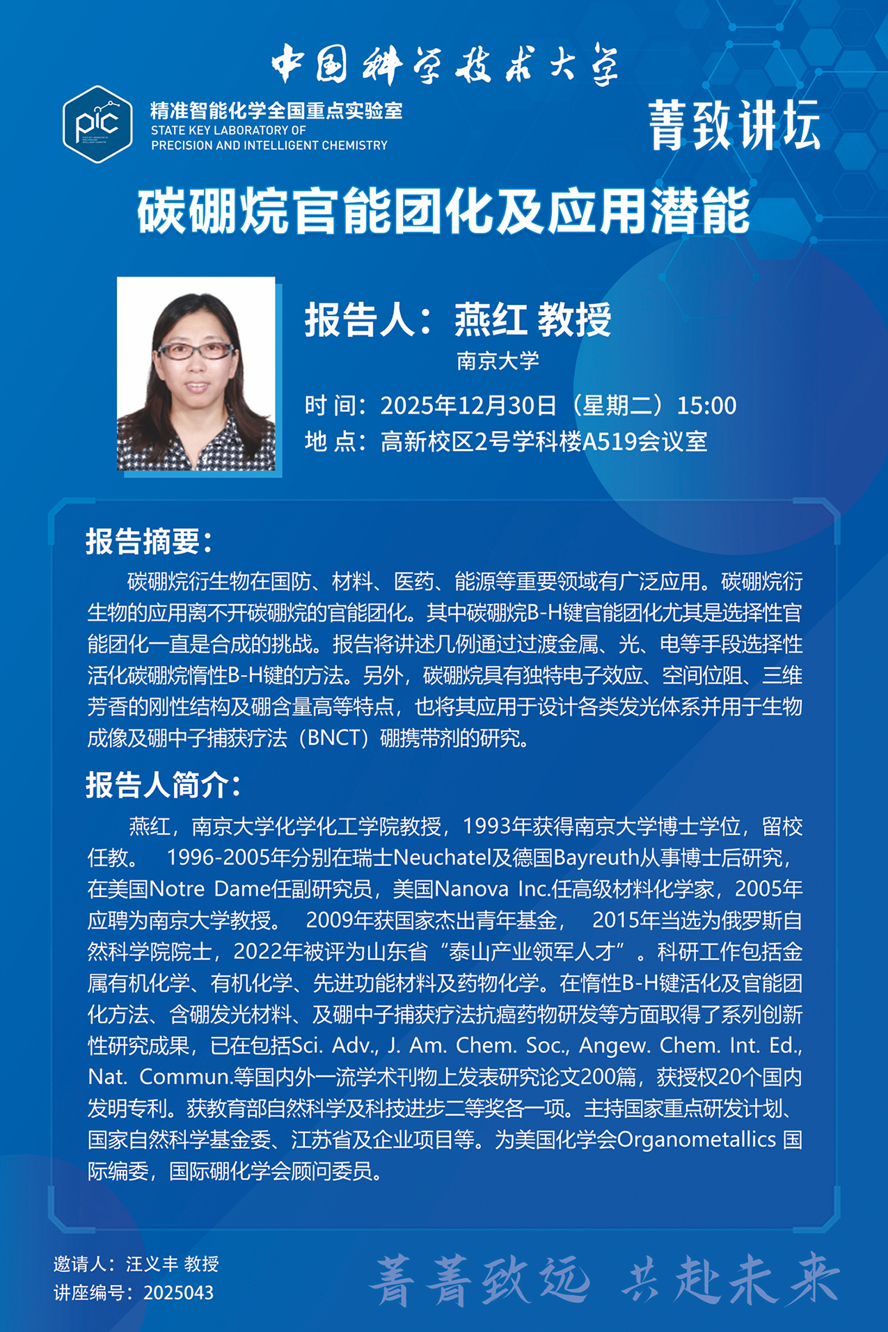 报告人简介 | 燕红,南京大学化学化工学院教授,1993年获得南京大学博士学位,留校任教。 1996-2005年分别在瑞士Neuchatel及德国Bayreuth从事博士后研究,在美国Notre Dame任副研究员,美国Nanova Inc.任高级材料化学家,2005年应聘为南京大学教授。 2009年获国家杰出青年基金, 2015年当选为俄罗斯自然科学院院士,2022年被评为山东省“泰山产业领军人才”。科研工作包括金属有机化学、有机化学、先进功能材料及药物化学。在惰性B-H键活化及官能团化方法、含硼发光材料、及硼中子捕获疗法抗癌药物研发等方面取得了系列创新性研究成果,已在包括Sci. Adv., J. Am. Chem. Soc., Angew. Chem. Int. Ed., Nat. Commun.等国内外一流学术刊物上发表研究论文200篇,获授权20个国内发明专利。获教育部自然科学及科技进步二等奖各一项。主持国家重点研发计划、国家自然科学基金委、江苏省及企业项目等。为美国化学会Organometallics 国际编委,国际硼化学会顾问委员。 |
