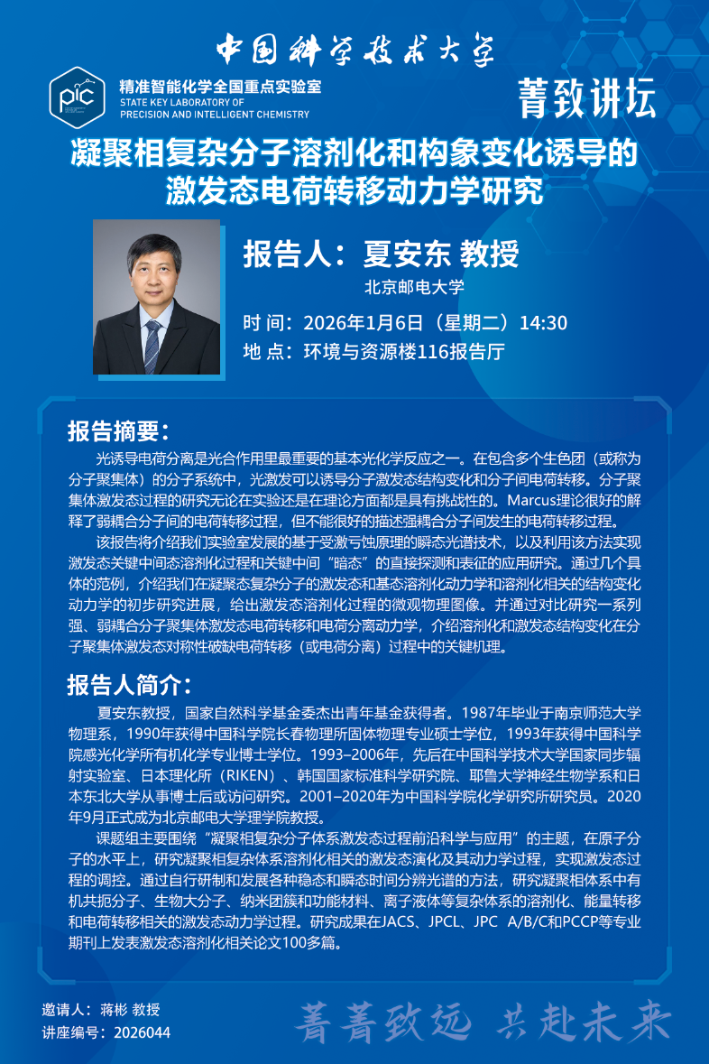 夏安东教授,国家自然科学基金委杰出青年基金获得者。1987年毕业于南京师范大学物理系,1990年获得中国科学院长春物理所固体物理专业硕士学位,1993年获得中国科学院感光化学所有机化学专业博士学位。1993–2006年,先后在中国科学技术大学国家同步辐射实验室、日本理化所(RIKEN)、韩国国家标准科学研究院、耶鲁大学神经生物学系和日本东北大学从事博士后或访问研究。2001–2020年为中国科学院化学研究所研究员。2020年9月正式成为北京邮电大学理学院教授。 课题组主要围绕“凝聚相复杂分子体系激发态过程前沿科学与应用”的主题,在原子分子的水平上,研究凝聚相复杂体系溶剂化相关的激发态演化及其动力学过程,实现激发态过程的调控。通过自行研制和发展各种稳态和瞬态时间分辨光谱的方法,研究凝聚相体系中有机共扼分子、生物大分子、纳米团簇和功能材料、离子液体等复杂体系的溶剂化、能量转移和电荷转移相关的激发态动力学过程。研究成果在JACS、JPCL、JPC A/B/C和PCCP等专业期刊上发表激发态溶剂化相关论文100多篇。 |