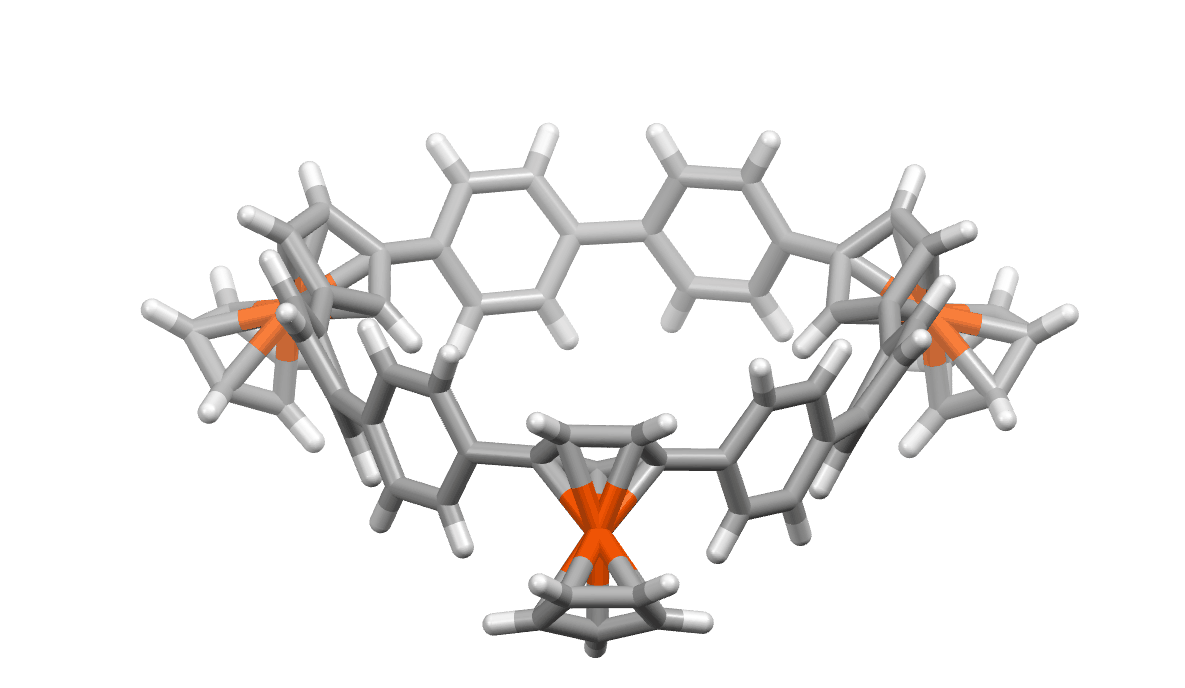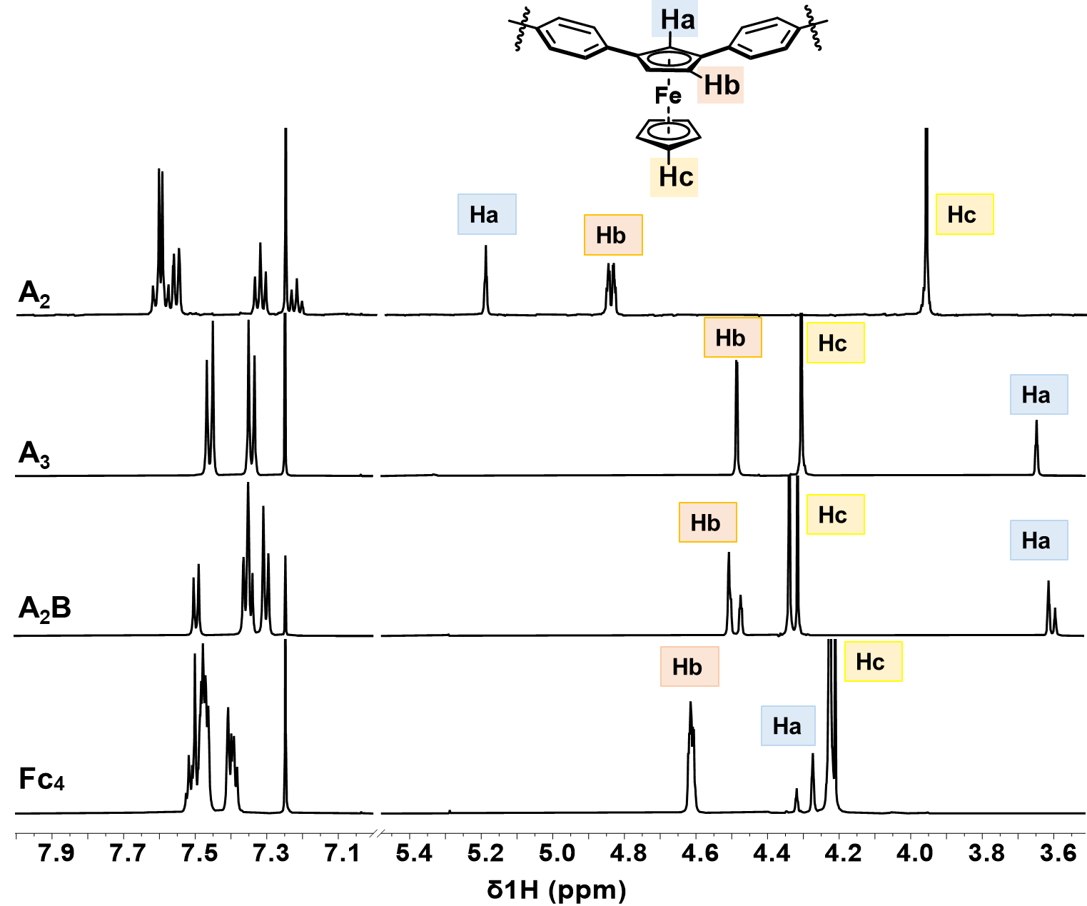 通过比较A2B、A3、A2和Fc4的 1H NMR谱,作者发现二茂铁上的三组氢原子核磁信号变化有着明显的不同(图3)。其中A3表现出一组二茂铁基信号,与理论上的C3V对称性一致,而A2B显示出与 CS对称性相对应出现两组信号。与A2相比,大环产物中二茂铁基单元由于环应变靠近了相邻苯环的屏蔽区,这导致嵌入环中的Cp上的氢原子信号(Ha和Hb)向高场移动。这种向高场位移现象比主链型二茂铁环更加明显。与之相反的是,当构象灵活的 Cp 环远离屏蔽区域时,Hc的化学位移向低场移动。而对于Fc4,随着环尺寸的增加导致环应变的减弱,相应的核磁信号逐渐向线性同系物中观察到的信号收敛。