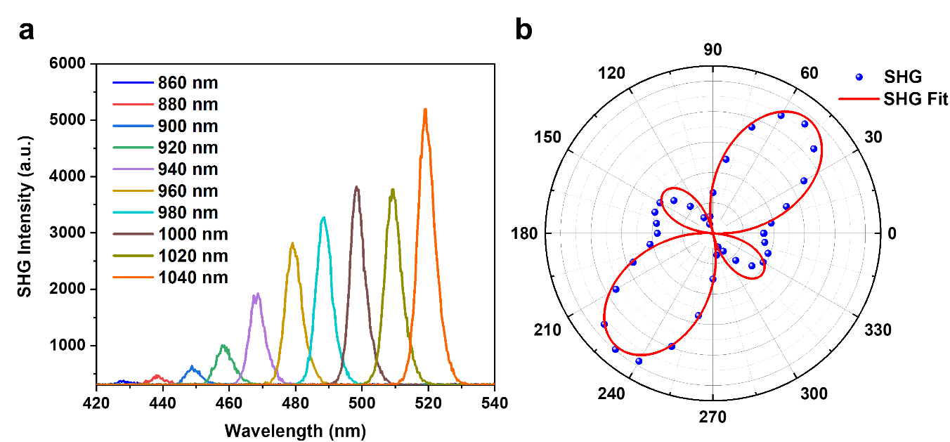 图5. (a) A2B单晶体在860至1040nm不同波长下的NLO光谱。(b) 入射波长为1040nm的A2B单晶体SHG信号的偏振相关性图