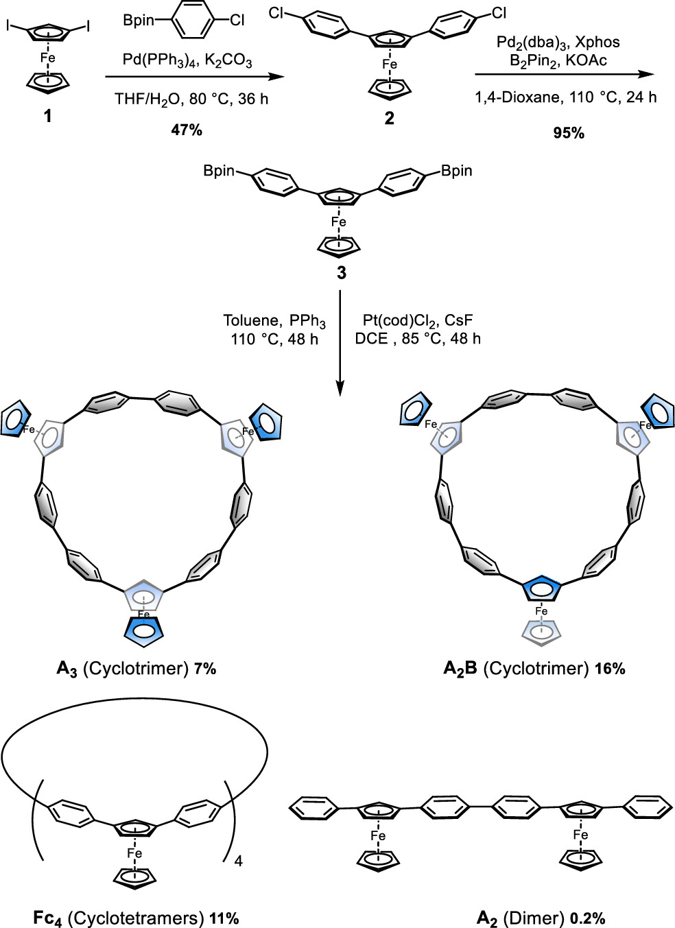 福州大学李远明教授等在Precision Chemistry上发表侧链型二茂铁共轭大环的合成文章。二茂铁共轭大环所表现出的电化学、芳香性和超分子特性与它们的形状以及氧化还原中心的数量、距离和连接性密切相关。因此,为了丰富侧链型二茂铁共轭大环的功能,作者引入1’3-二芳基取代的二茂铁作为功能基元以及结构基元,合成了其三聚体以及四聚体(图2)。其中三聚体成功分离得到两种不同立体异构体的大环(A2B和A3),通过单晶X射线衍射分析,确定了这些大环结构以及独特的二茂铁基与大环的主-客相互作用特性。