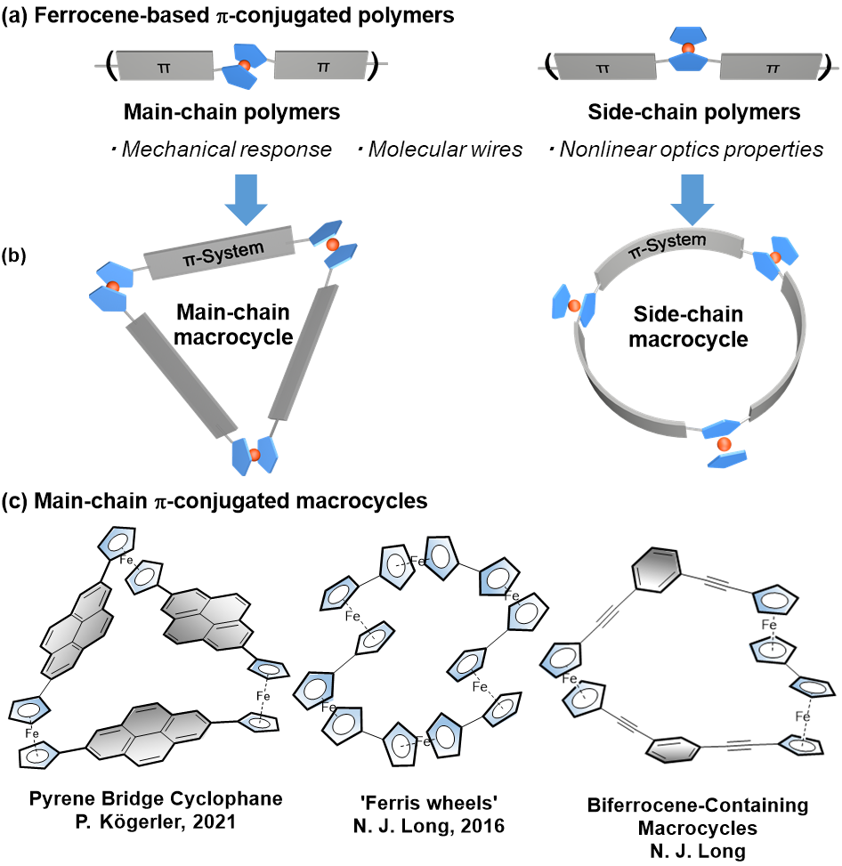 图1. (a) 基于二茂铁的共轭聚合物的概念表示;(b) 主链和侧链型二茂共轭大环示意图;(c) 主链型二茂共轭大环的代表性实例;