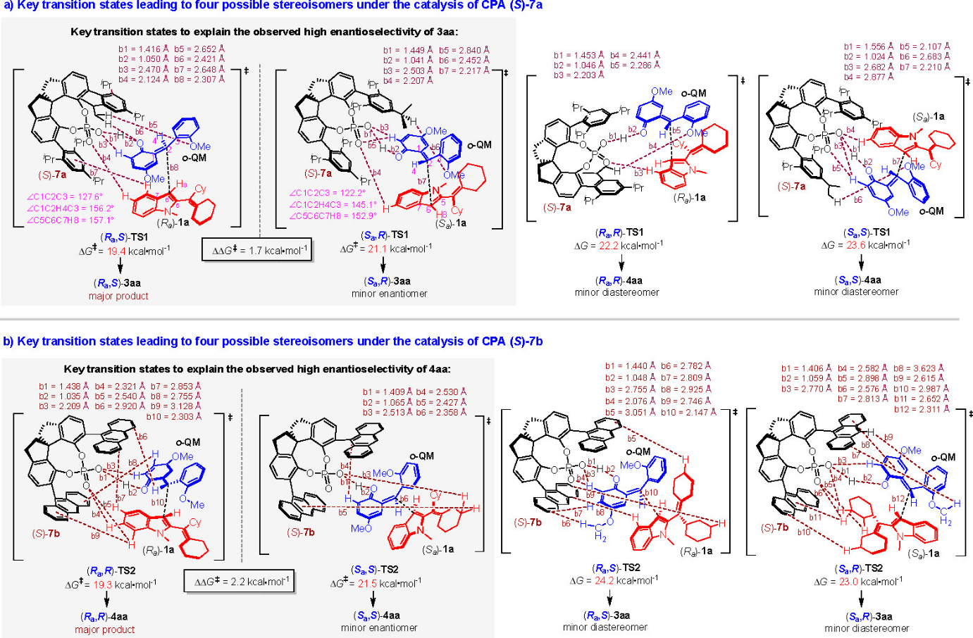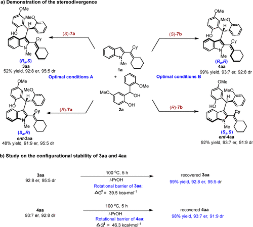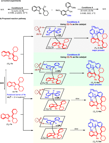 通过控制实验,作者认为邻羟基苄醇脱水形成邻亚甲基苯醌中间体(o-QM),进而与手性磷酸形成氢键对反应活性的控制具有重要作用(图10a)。基于这一结果,作者提出了可能的反应路径(图10b)。化合物1a的旋转能垒为21.4 kcal·mol-1,这表明(Ra)-1a和(Sa)-1a可以快速相互转化。在手性磷酸(S)-7a及(S)-7b活化下,(Ra)-1a与邻羟基苄基醇2a脱水生成的邻亚甲基苯醌中间体(o-QM)迅速发生亲核加成反应,非对映发散性生成相应产物(Ra,S)-3aa及(Ra,R)-4aa。与之相比,由于构型匹配的问题,(Sa)-1a与o-QM的亲核加成反应非常缓慢,(Sa)-1a反而会通过快速消旋化过程转化为(Ra)-1a,从而实现动态动力学转化。