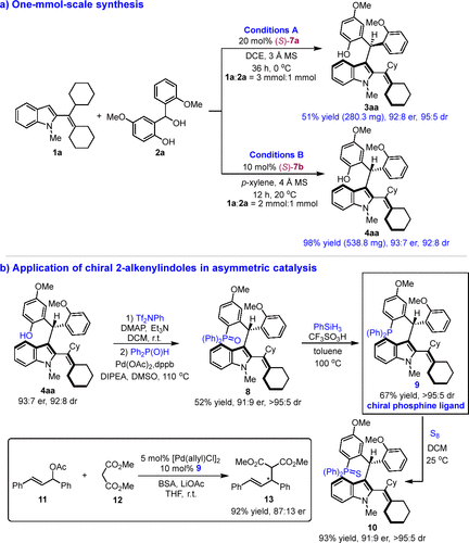 随后,作者进行了1 mmol规模放大量实验,反应结果与0.1mmol规模相似(图8a)。为了研究产物的用途,作者将产物4aa转化成手性膦配体9,这类手性配体在烯丙基碳酸酯11与丙二酸二乙酯12的催化不对称烯丙基化反应中表现出了较好的催化活性(图8b)。该结果表明这类多重手性元素2-乙烯基吲哚在手性催化剂开发中具有较为广阔的应用前景。
