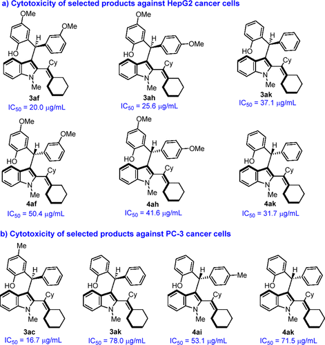 为了探究该类骨架可能的生物活性,作者对产物进行了抗肿瘤活性筛选,发现部分产物对HepG2和PC-3肿瘤细胞具有较好的细胞毒活性(图9)。
