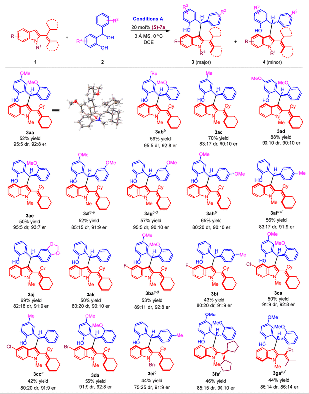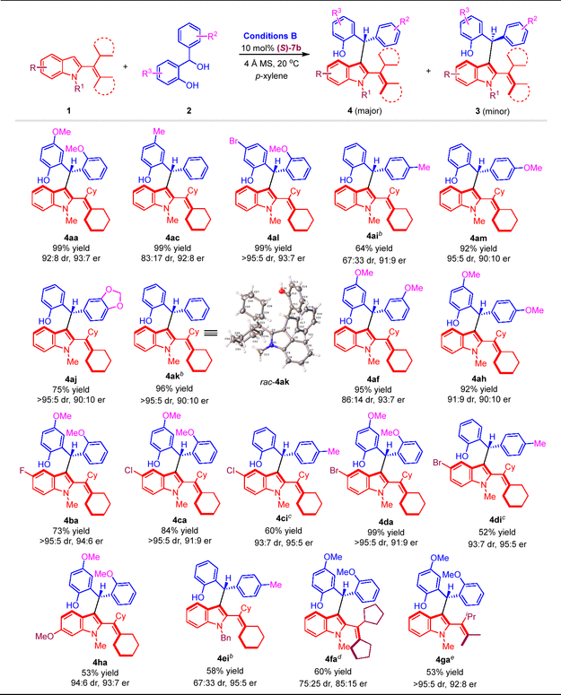 作者选用2-乙烯基吲哚1a与邻羟基苄醇2a作为底物尝试此反应(图4),发现使用3,3’位带有不同取代基的手性磷酸能够调控反应的非对映选择性,经过详细的条件优化,最终以52%收率、92:8 er、95:5 dr (3aa:4aa)获得产物3aa (conditions A);以99% 收率、93:7 er、92:8 dr (4aa:3aa)获得化合物4aa (conditions B)。