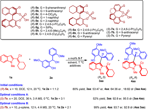 为了解决这些问题,作者设计了手性磷酸催化下C3-未取代2-乙烯基吲哚与邻羟基苄醇的不对称加成反应(图3b)。选择邻羟基苄醇作为具有潜中心手性的大位阻亲电试剂,是由于邻羟基苄醇在Brønsted酸活化下可以转化成成高活性的邻亚甲基苯醌中间体,在发生加成反应的同时能够产生中心手性。选择手性磷酸作为高效的催化剂,是基于手性磷酸在活化邻羟基苄醇中的优势。