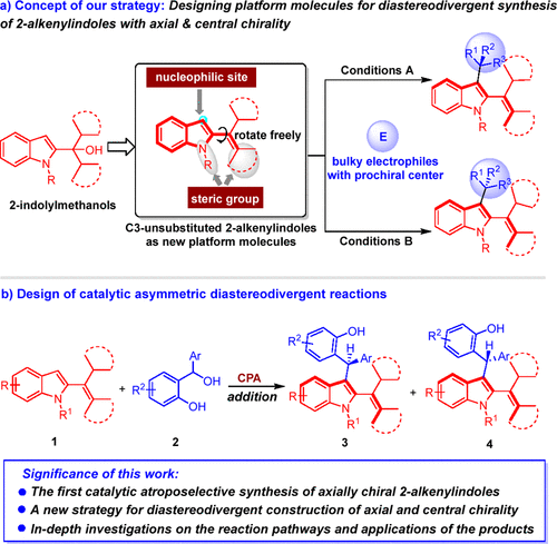 为解决兼具轴手性与中心手性化合物催化不对称非对映发散性合成中的挑战性问题,并实现轴手性2-乙烯基吲哚的高效构建,江苏师范大学石枫教授、张宇辰教授等设计开发了C3-未取代2-乙烯基吲哚作为新型的吲哚平台分子,通过调控反应条件,实现了兼具轴手性及中心手性的2-乙烯基吲哚的催化不对称非对映发散性合成。