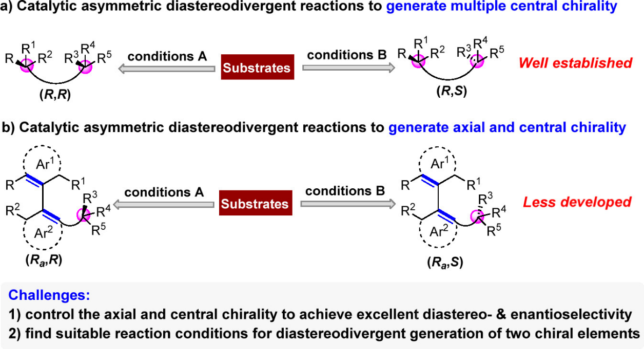 多重手性化合物在药物化学与材料化学等领域具有重要的应用价值,这类化合物的绝对及相对构型都会影响其物理性质及药理性质,因此,获得多重手性化合物的所有立体异构体具有重要的意义。催化不对称非对映发散性合成从相同的原料出发,仅轻微改变反应条件,就可以获得多重手性化合物的所有立体异构体,是获得多重手性化合物所有立体异构体最高效的方式之一。目前,利用这一策略合成多重中心手性化合物发展的较为成熟(图1a),但是,催化不对称非对映发散性合成兼具轴手性与中心手性化合物的研究却非常少(图1b)。这一领域主要存在以下挑战性问题:1)如何控制轴手性与中心手性,以获得较好的对映及非对映选择性;2)如何调控反应条件,实现两种手性元素的非对映发散性产生。