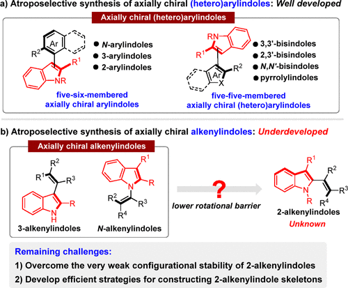 轴手性吲哚骨架广泛存在于众多天然产物、生物活性分子、手性催化剂之中,这类骨架的催化不对称构建成为一个新兴的研究领域。近年来,化学家们通过不对称催化的策略相继构建了结构多样的轴手性(杂)芳基吲哚骨架(图2a),与之相比,更具挑战性的轴手性乙烯基吲哚骨架的催化不对称构建发展的较为缓慢(图2b)。目前,仅有一些合成轴手性3-乙烯基吲哚、N-乙烯基吲哚的报道,旋转能垒更低的2-乙烯基吲哚的催化不对称构建一直没有实现。如何克服轴手性2-乙烯基吲哚较低的构型稳定性,发展高效的策略实现此类骨架的构建是这一领域的难点。
