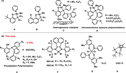 图1.(a)具有代表性的膦基酚镍催化剂。(b)用于沉淀聚合的过渡金属催化剂。