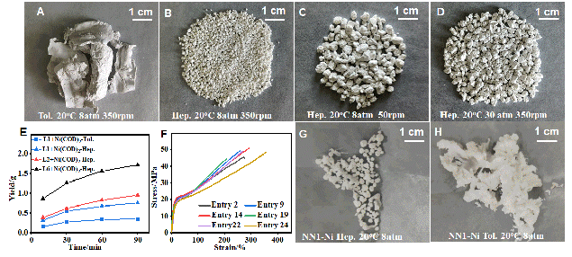 图3. (A-D) 不同溶剂,乙烯压力及搅拌速度下聚合物的形貌调控。(E)催化剂的热稳定性研究。(F) 制备的UHMWPE的力学性能。(G-H)其他催化剂体系对聚合物形貌的改进。
