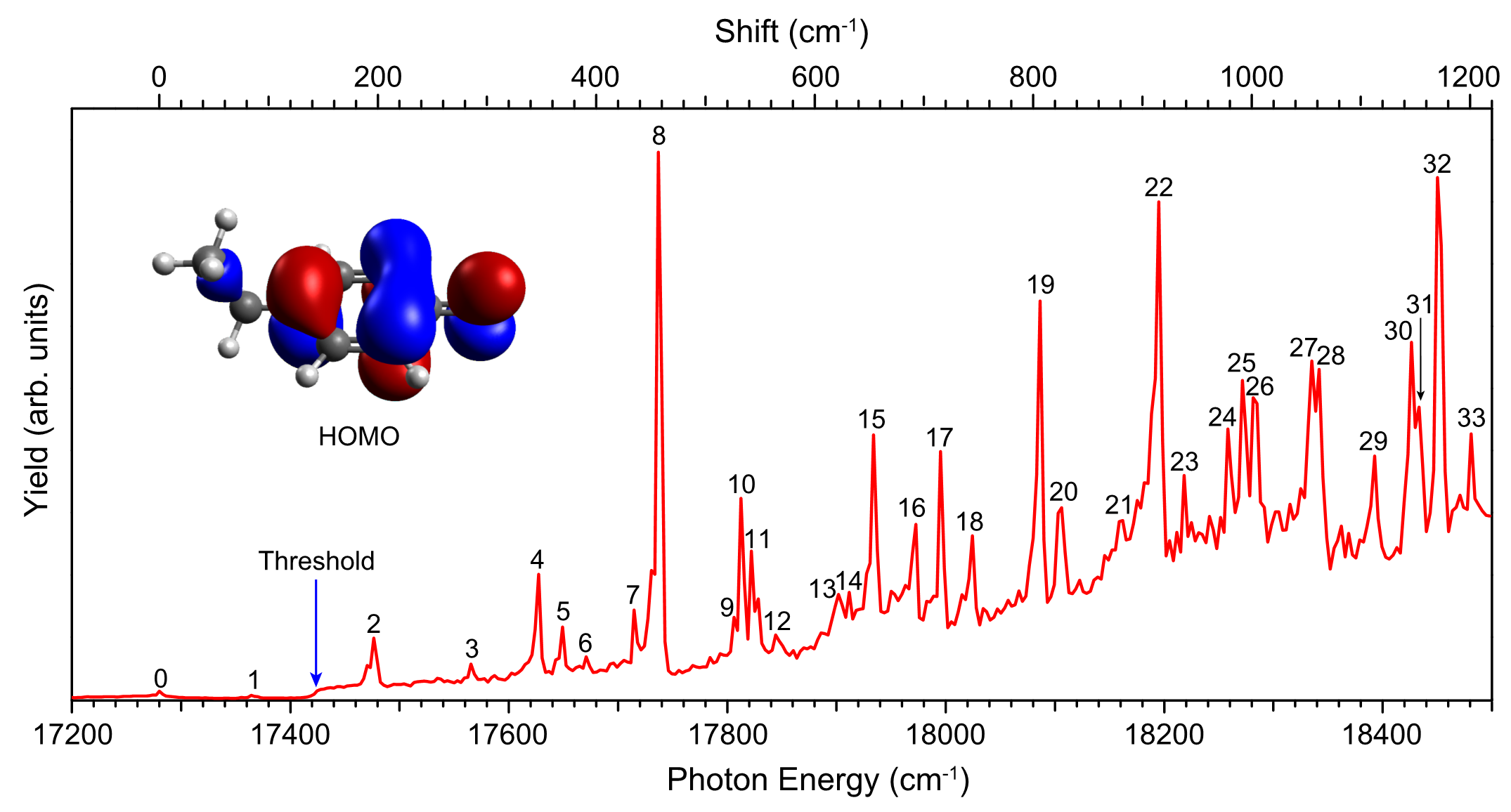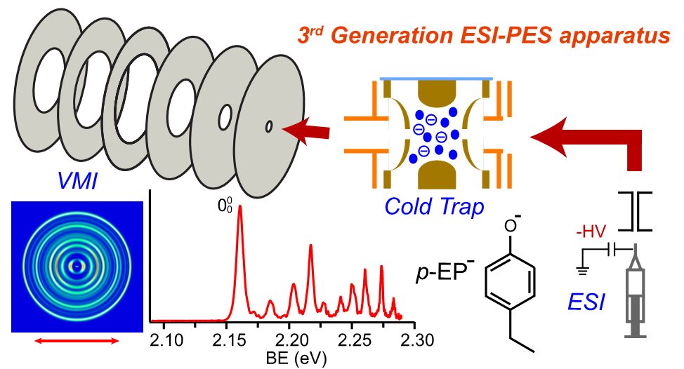 近日,布朗大学王来生教授团队利用第三代电喷雾电离-光电子谱(ESI-PES)实验装置,结合低温离子阱、高分辨光电子成像和可调谐激光系统,深入研究了低温冷却的脱氢对乙基苯酚负离子(p-EP-)在脱附阈值附近的光脱附谱与基于偶极束缚态的共振光电子谱。精确测量了p-EP自由基的电子亲和能(2.1604 ± 0.0004 eV,17425 ± 3 cm-1)和离子偶极束缚态的结合能(145 cm-1)。通过对实验谱图进行解析,精确测量了p-EP自由基17个振动模式的频率信息,包含6个Franck-Condon非活性的振动模式,并成功观测到p-EP-负离子偶极束缚态振动自电离过程中发生的电子-分子非弹性散射过程。