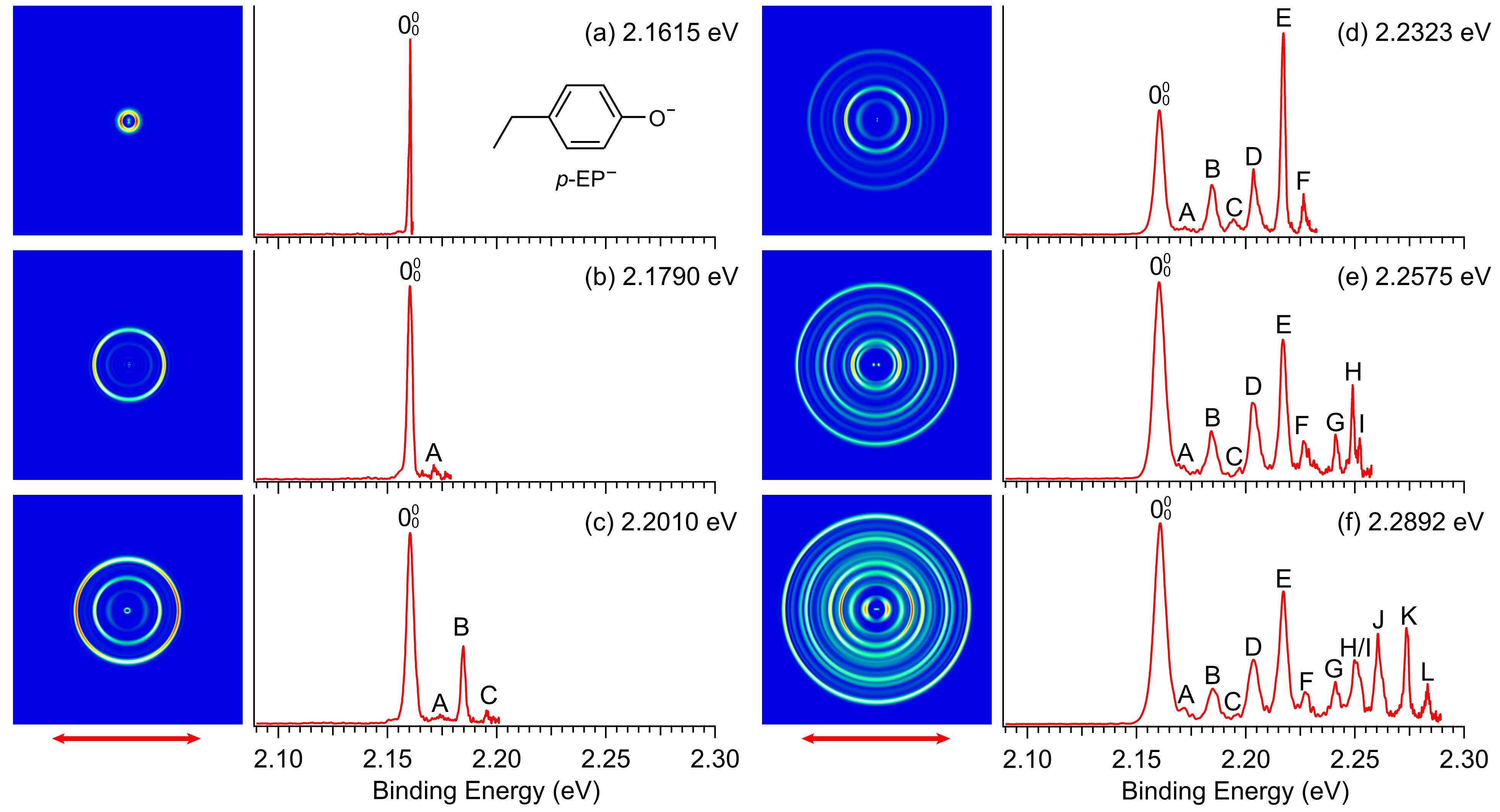 该研究工作通过采集脱氢对乙基苯酚负离子(p-EP-)在脱附阈值附近的光电子谱,精确测量了p-EP自由基的电子亲和能为2.1604 ± 0.0004 eV,并在更高光子能量的非共振光电子谱中分辨出p-EP自由基更多的振动结构(图1)。