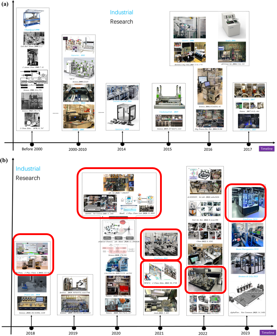 图1. 机器人在化学实验中应用的一些代表性案例。其中红框部分的架构为朱熹教授团队开发的化学实验机器人。