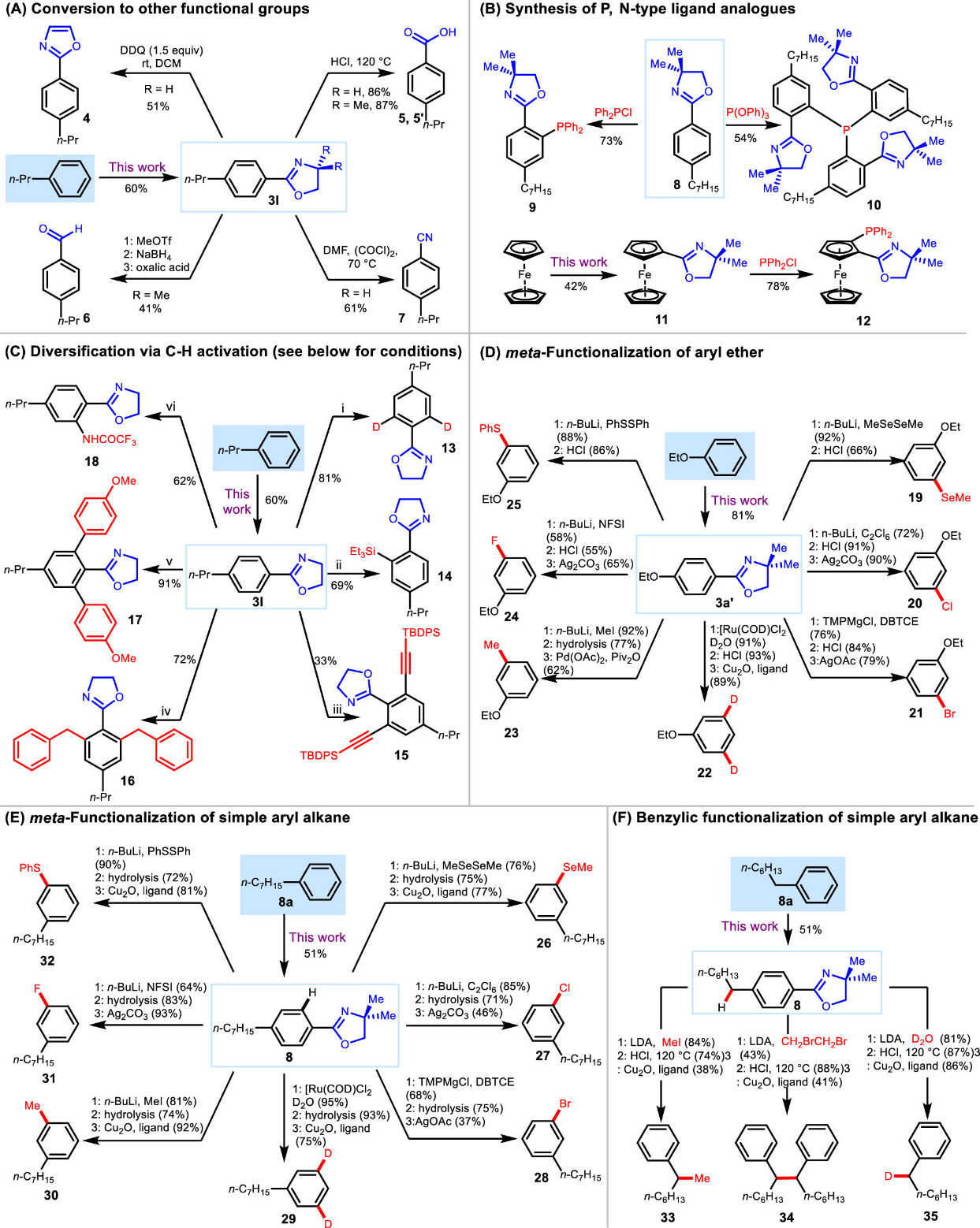 在考察完底物适用范围以后,为了说明该方法的合成价值,作者制备了很多其它方法很难制备的官能团化芳烃。主要包括(a)将噁唑啉直接转化成羧酸,醛,腈和恶唑;(b)直接从芳烃制备PHOX-型配体;(c)噁唑啉导向的邻位碳氢键活化反应;(d)乙氧基苯的间位硒化,氯化,溴化,氘化,甲基化,氟化和硫化等官能团化反应; (e)正庚苯的间位硒化,氯化,溴化,氘化,甲基化,氟化和硫化等官能团化反应;(f)正庚苯的苄基位甲基化,氘化和二聚。这些例子清晰地表明,该亲电芳香噁唑啉化可以用于合成其它方法不能制备的多样性芳香化合物。