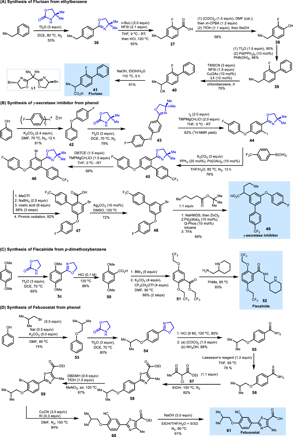 除了在芳香族化合物的多样化方面的应用外,作者还利用该芳香噁唑啉化反应作为关键步骤从简单的芳烃作为起始原料合成了氟比洛芬,γ-分泌酶抑制剂,氟卡尼和非布索坦四个药物分子(图4)。
