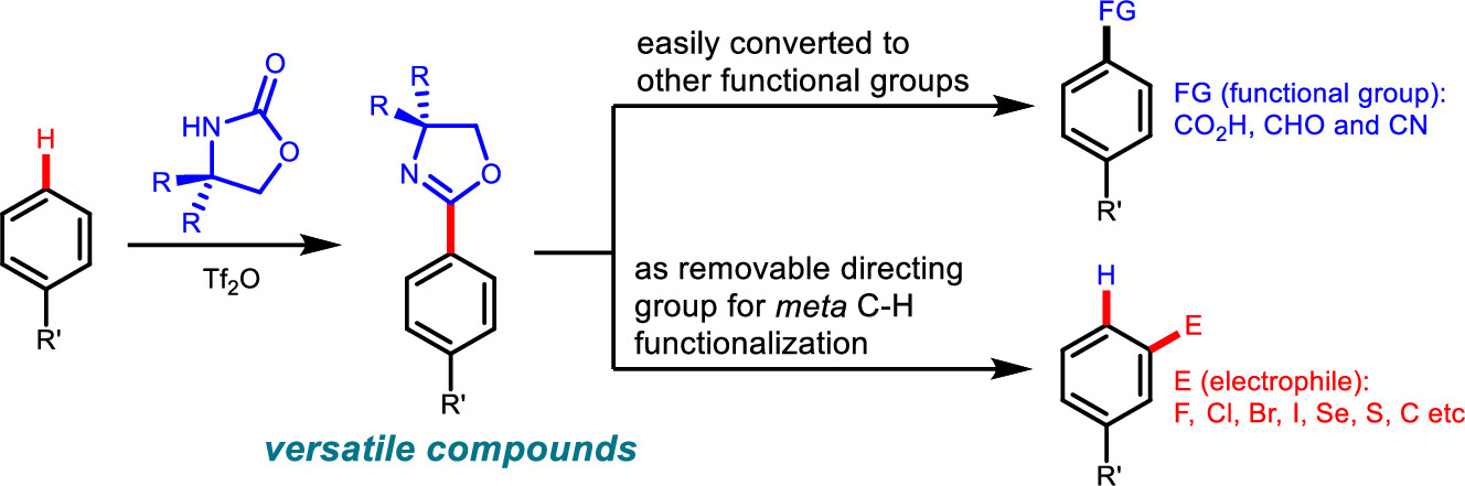 中山大学刘文博教授团队报道了一种芳香碳氢键噁唑啉化的方法,该方法基于三氟甲磺酸酐作为噁唑烷酮的活化试剂,在简单的条件下,高效实现了芳环碳氢键噁唑啉化的反应,该方法底物范围广,官能团兼容性好,易于放大。通过使用该策略作为关键步骤,可以实现多样芳烃的复杂官能团化,也可以用来合成重要的药物分子。基于该方法的简单有效,该方法在有机合成中有望获得广泛的应用。