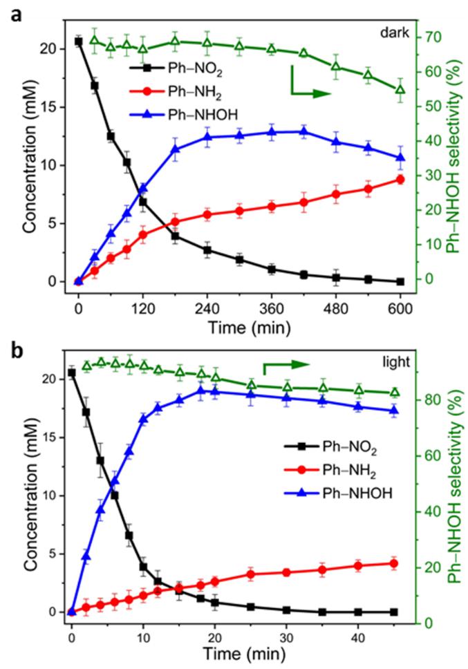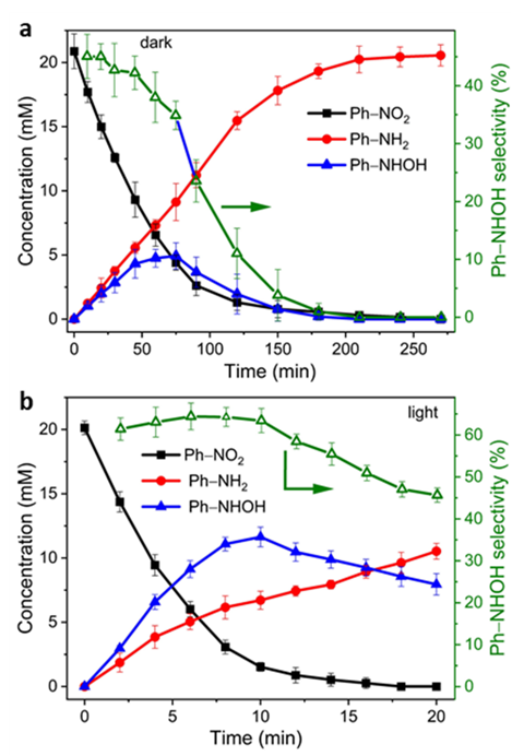 图2:硝基苯氢化的动力学和N-苯基羟胺选择性在(a)黑暗和(b)光照情况下的比较,催化剂为三乙醇胺 (TEA)修饰的铂纳米颗粒负载在二氧化硅球上。