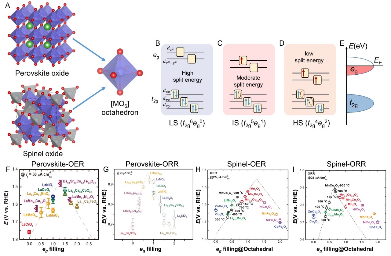 图2. 钙钛矿和尖晶石中的八面体配位场中的三种自旋态(低、中和高)和eg轨道占据数与OER/ORR性能之间的火山图