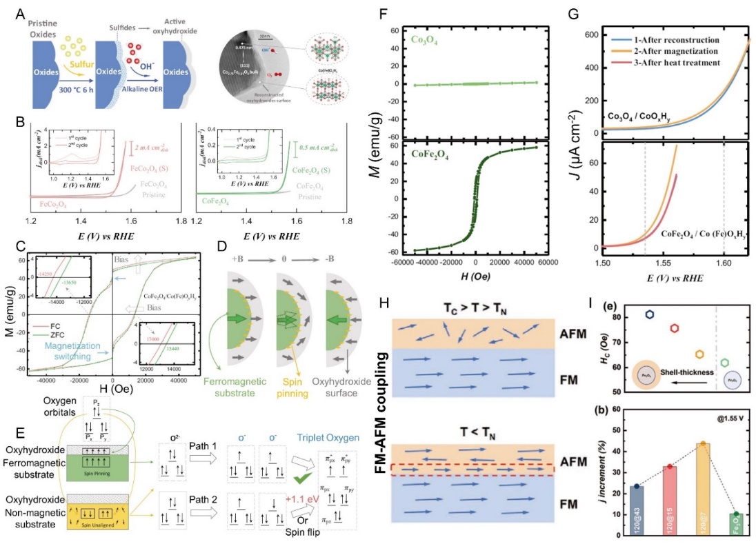 外部磁场通过增强自旋极化效应,已被证明可以提高与自旋相关的氧电催化性能。然而,去除外部磁场后,活性往往会降低,这限制了燃料电池和金属空气电池等应用的商业化。因此,利用磁性催化剂本身的磁性来构建内部磁场,加速自旋相关的氧电催化反应,是克服这些挑战的有效途径。