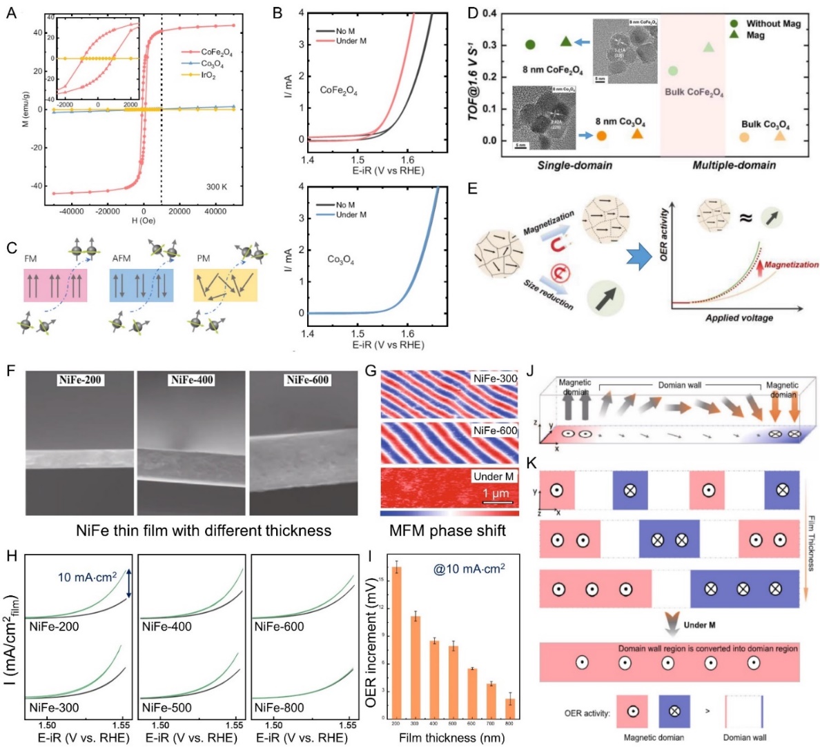 外磁场强化OER的现象已被广泛报道,但其本质的原因一直不太明晰,本综述深入讨论了其强化机制。为了进一步阐明磁场对OER的自旋极化机制,研究人员通过减低尺寸,得到了单畴的CoFe2O4,其在磁场下没有强化效果。而多畴的块体CoFe2O4对外磁场有着明显的响应,这是因为多畴的铁磁性CoFe2O4在磁场作用下磁畴会整齐排列,促进自旋电子的排列以满足三重态O2的形成需求,从而增强OER活性。