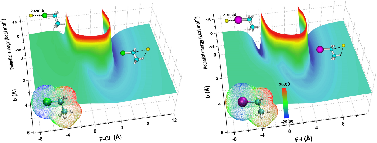 图4. F− + EtY [Y = Cl(左)和I(右)]入口通道相互作用势及底物分子静电势(插图)