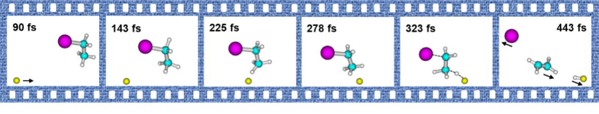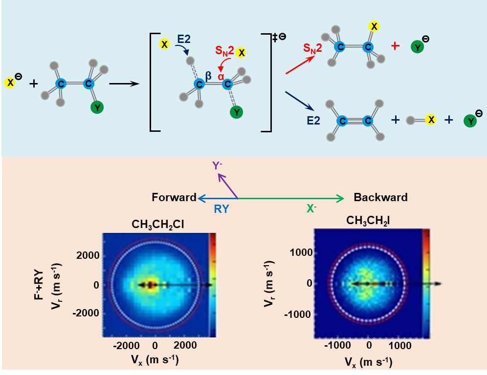 EtY (Y = Cl, I)与氟离子的E2/SN2反应体系势能面结构十分相近,预示体系具有相似的反应动力学。然而交叉分子束实验却发现二者呈现不同的散射特征:当离去基团由Cl变为I时,产物离子速率分布会由前后对称转变为倾向于前向和边向散射。这是否意味着两个反应体系具有不同的E2/SN2选择性?是什么因素影响了竞争反应,微观反应机理是怎样的?为理解这些问题我们开展了动力学模拟。