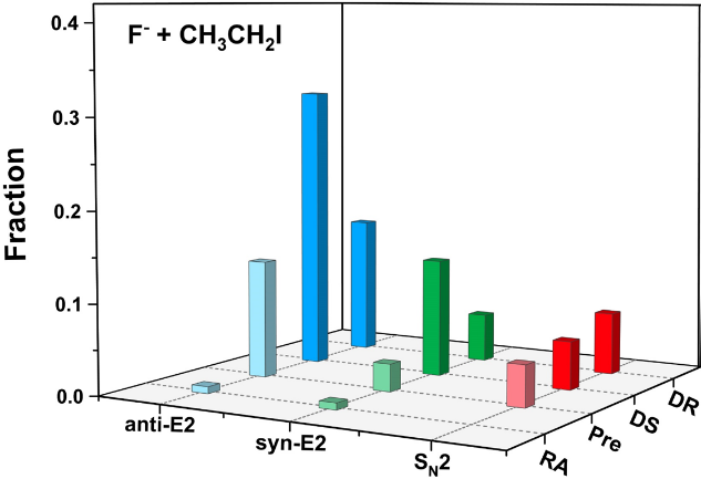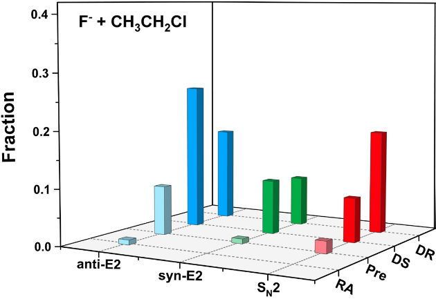 图3. 反应机理分支比。直接反应通过弹回(DR)和剥离(DS)机理进行,间接反应通过形成复合物(Pre)和迂回机理(RA)发生。
