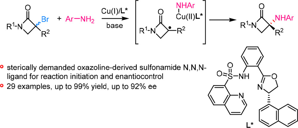 南方科技大学刘心元团队在自由基不对称催化领域中发展了“铜/手性阴离子催化剂为新型单电子转移催化剂”的策略,利用手性阴离子配体调控金属铜的氧化还原电势,引发卤代烷烃产生烷基自由基,然后通过多种手性诱导模式实现烷基自由基物种的对映选择性控制,为自由基不对称催化反应提供了一种新策略(J. Am. Chem. Soc. 2022, 144, 17319 (Perspective))。基于此,刘心元团队利用铜/多齿配体催化体系实现了外消旋三级α-溴-β-内酰胺与芳胺的立体汇聚式C(sp3)−N交叉偶联反应,高效,高对映选择性地构筑了一系列具有潜在生物医药应用前景的手性α-氨基-β-内酰胺。