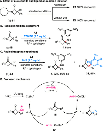 为了深入了解反应机理,研究团队设计并进行了一系列的控制实验:(1)模板反应在没有胺A1或配体L*8的情况下,都没有观察到E1的转化。这表明,配体、铜和胺三者形成的手性配体螯合的Cu(I)-氨基配合物可能是催化循环的第一步;(2)通过自由基抑制试验证明了反应可能涉及自由基过程;(3)通过自由基钟实验证明了反应过程中生成了三级环烷基自由基物种。基于上述实验,研究团队提出反应的可能机理:首先,在碱存在下,Cu(I)与手性配体L*反应生成Cu(I)L*配合物I。随后,配合物I与芳胺进行配体交换生成L*Cu(I)-氨基配合物II。接着,中间体II通过单电子还原过程将外消旋α-溴-β-内酰胺还原生成前手性烷基自由基III。最后,自由基III与二价铜物种IV相互作用实现对映选择性C(sp3)−N偶联,并再生Cu(I)L*配合物I从而完成催化循环(图3)。