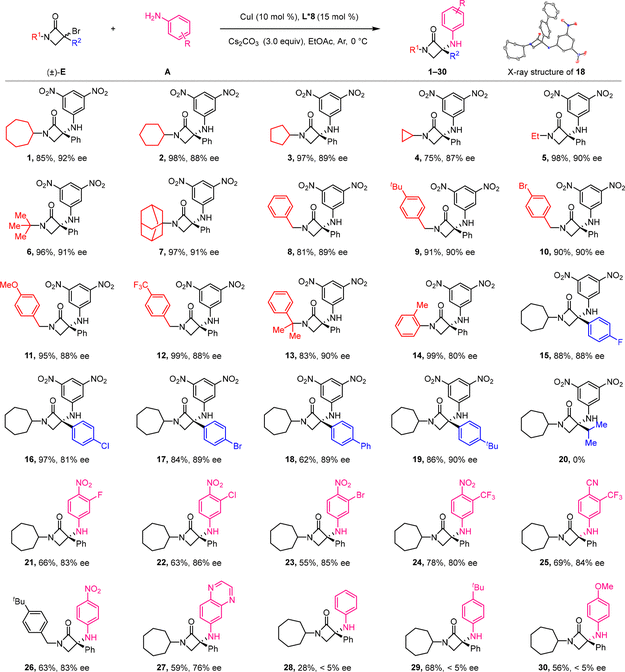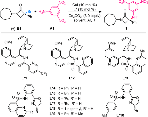 研究团队首先以三级α-溴-β-内酰胺E1和芳胺A1为模板底物,对配体、反应溶剂、温度等条件进行筛选,最终以良好的产率(86%)和优秀的对映选择性(92% ee)得到产物1(图1)。