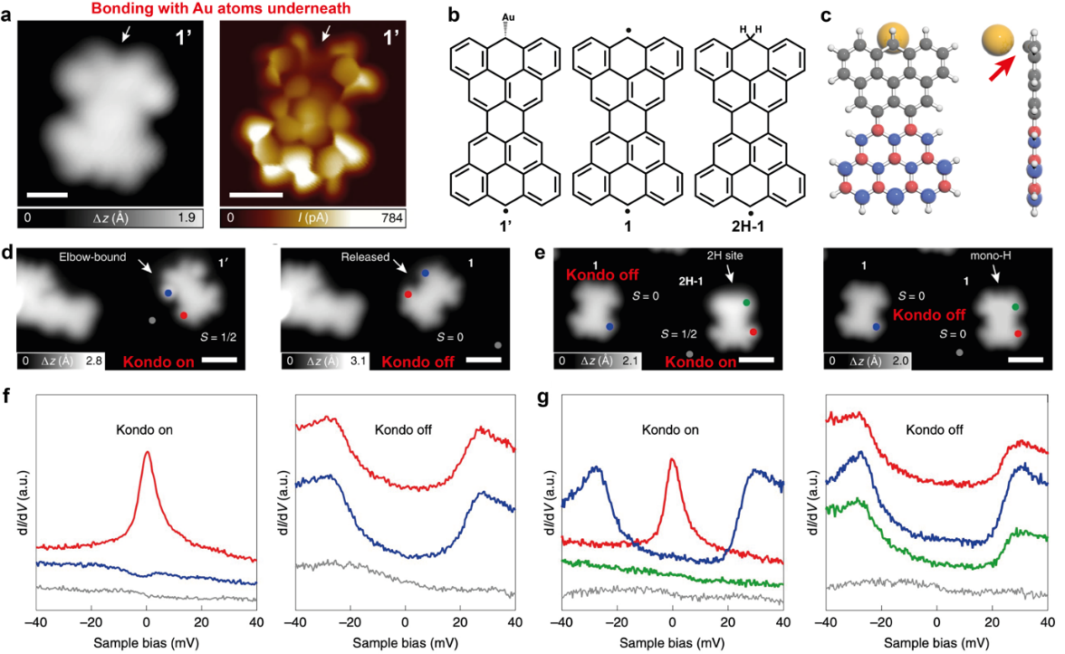 图4. (a) 左图: 在Au(111) 表面鱼骨纹重构拐角处成键的Clar's goblet分子的STM和BR-STM图像。(b) Clar's goblet分子与鱼骨纹重构拐角处成键的产物 (产物1')、Clar's goblet 分子 (产物1) 和单侧被氢原子饱和钝化的Clar's goblet分子的化学结构示意图。(c) 基于DFT模拟的Clar's goblet体系被金原子化学吸附的自旋密度分布顶视图和侧视图。(d-e) 通过针尖操控改变Clar's goblet 分子吸附构型位点 (d) 和通过针尖敲除饱和sp3氢原子 (e) 的STM图像。(f-g) 分别在图 (d) 和 (e) 中采集的对应的dI/dV谱。
