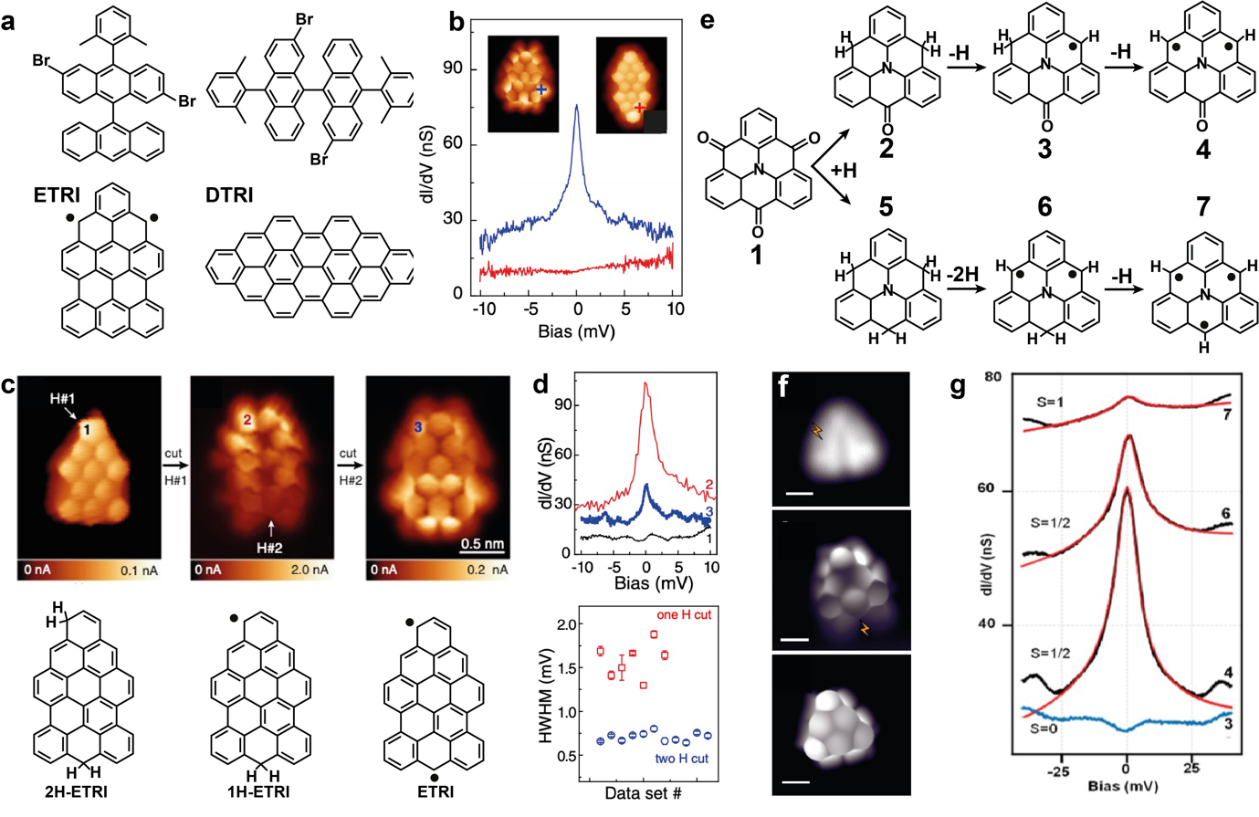 由于双自由基分子的高反应性,形成的ETRI分子的锯齿边经常被两个额外的氢原子保护,通过STM/AFM针尖精确敲除保护位点上的一个sp3氢原子,进而实现对于三角烯衍生物的制备与调控。这项工作不仅展示了利用探针化学制备三角烯衍生物,而且还展现了分子自旋构型从S=0到S=1 / 2和S=1的逐步调控,为研究在弱耦合金属衬底上的分子内自旋-自旋相互作用提供了思路。