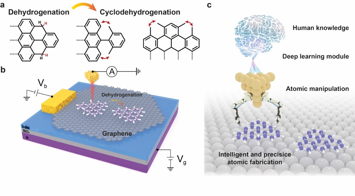 图6. (a) 目前两种制备单分子π磁体的合成策略。左图:通过针尖裂解饱和sp3氢原子的脱氢策略。右图:采用催化衬底加热活化实现环化脱氢进而扩展π-电子骨架的合成策略。 (b) 在门电极石墨烯器件上制备单分子π磁体的示意图。虚线箭头表示针尖触发的脱氢反应的完成。(c) 将原子操纵技术和深度神经网络结合以实现智能和精确的原子制造的示意图。