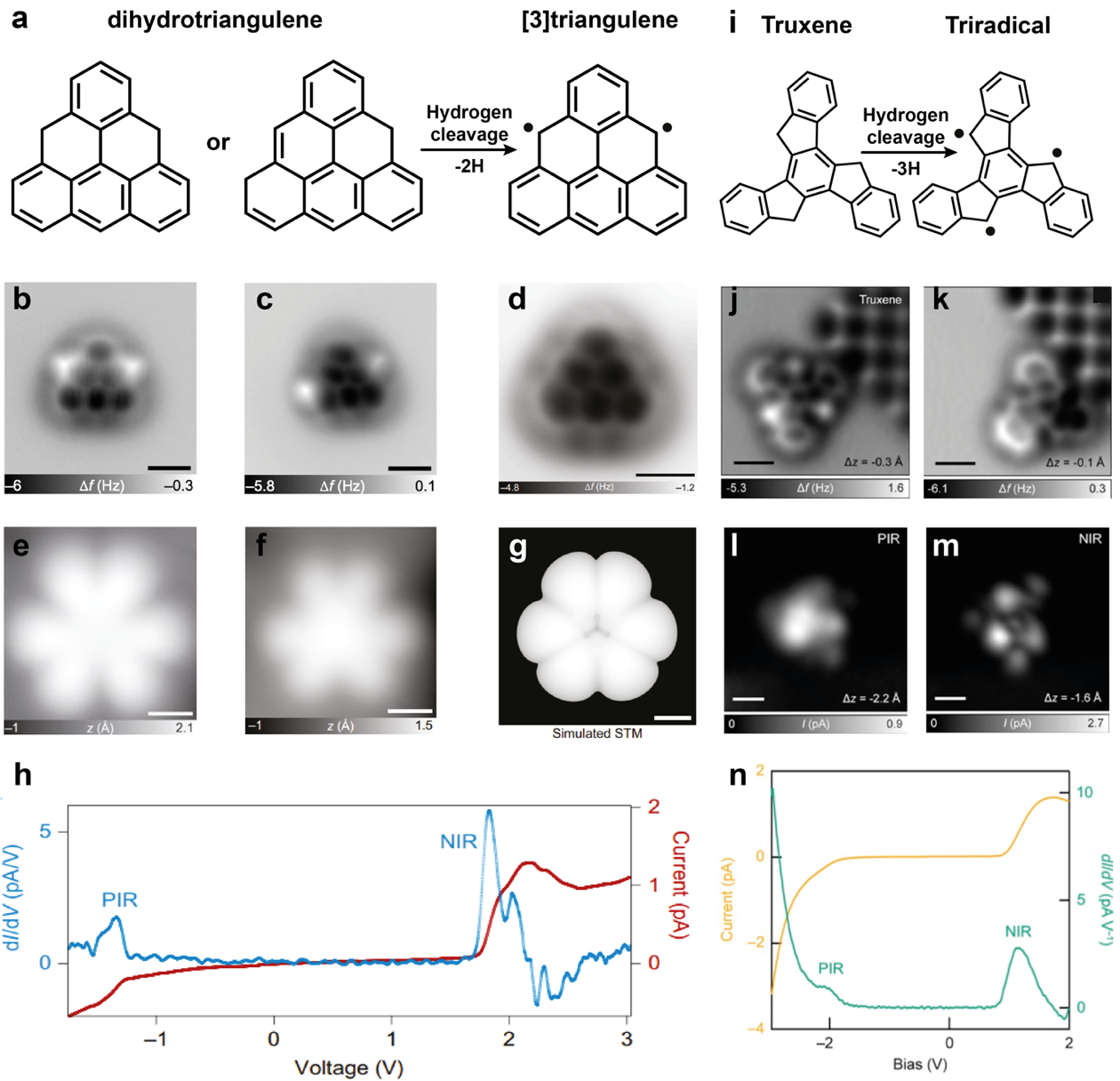 图2. (a) 用两种异构体二氢三角烯前驱体制备[3]三角烯。(b-d) 前体异构体与[3]三角烯分子对应的nc-AFM图像。(e-f) 负离子共振(NIR, e) 和正离子共振(PIR, f) 下偏置电压下[3]三角烯的STM图像。(g) 利用简并前线轨道模拟的STM图像(s波针尖)。(h) 在Xe/Cu(111)表面的[3]三角烯分子采集的dI/dV谱。(i) 利用原子操控制备非苯类多环三自由基基分子。(j-k) 前驱体truxene (j)和三自由基产物 (k) 在双层 NaCl/Cu(111) 表面的nc-AFM图像。(l-m) 三自由基产物在正离子共振 (PIR, l) 和负离子共振 (NIR, m) 能量附近使用CO 分子修饰的针尖获得的恒高模式的STM图像。(n) 在三自由基产物上采集得到的恒高I-V谱以及对其进行数值微分得到dI/dV谱。