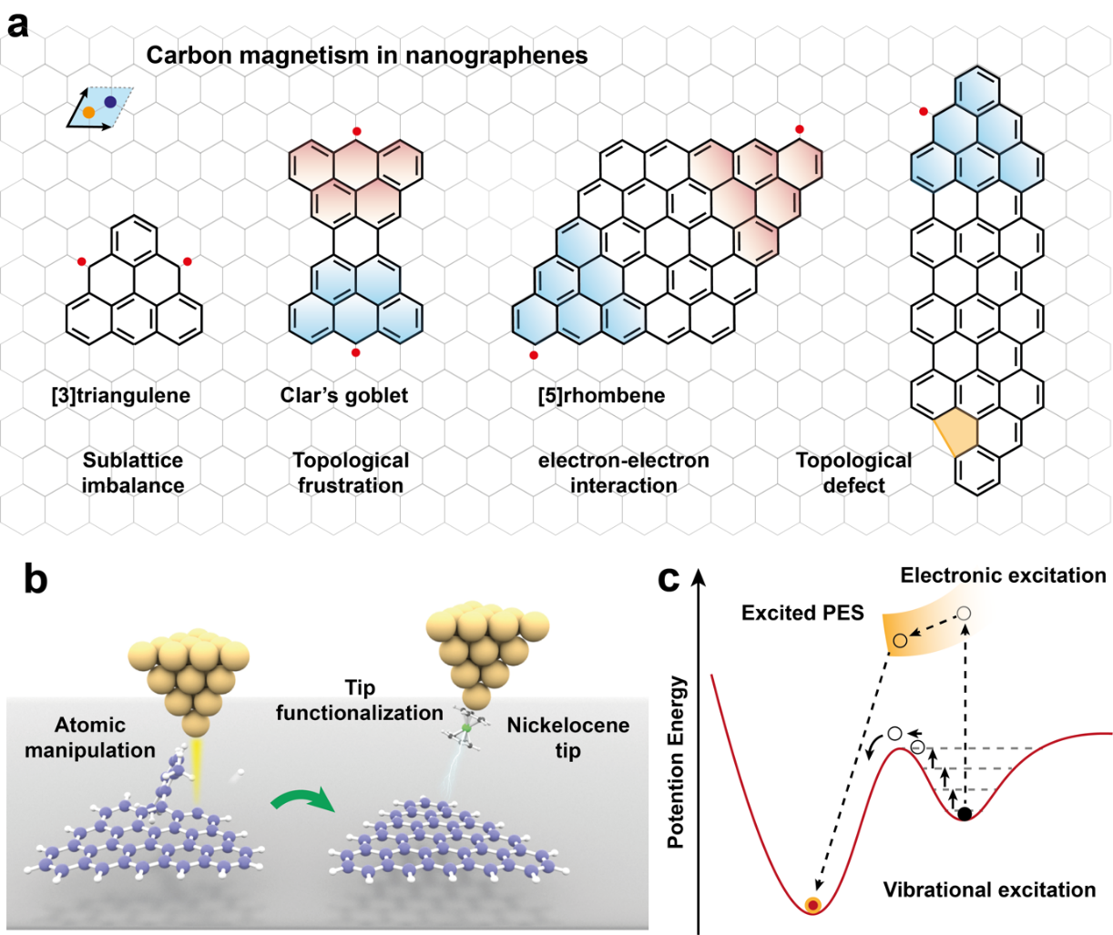 图1. (a) 磁性纳米石墨烯内π磁性设计示意图。(b) 原子操纵技术在构建与表征纳米石墨烯的示意图。左:通过针尖实现精确合成磁性纳米石墨烯。右:利用针尖顶端修饰二茂镍(Nc)分子的示意图,该方法可用于探测纳米石墨烯的磁性信息。(c) 基于原子操纵技术实现单分子反应的路径机理示意图。红色曲线是简化势能面(PES)示意曲线,展示了通过振动激发和电子激发的导致的键解离过程。