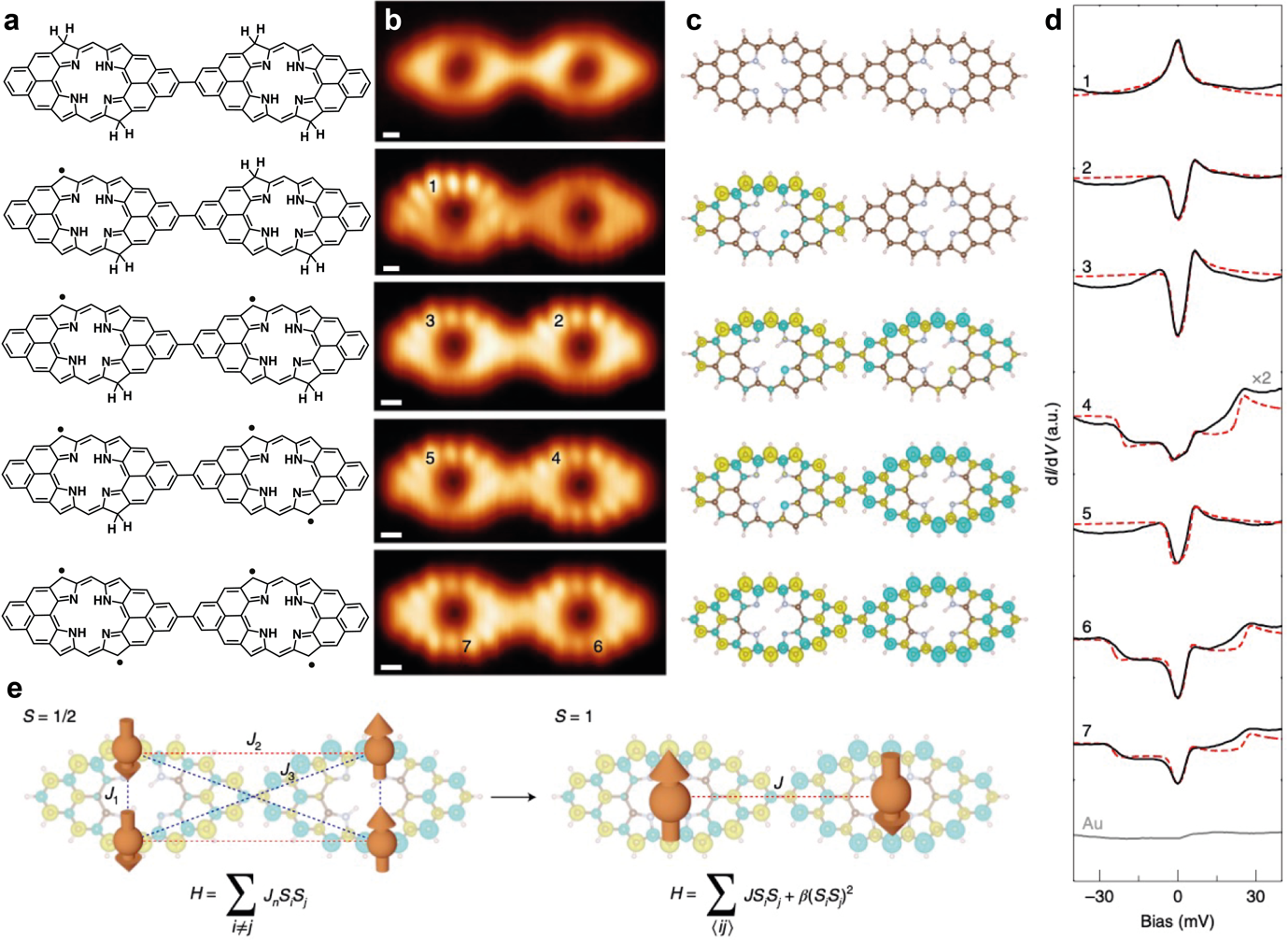 图5. (a-c) 通过分步原子操纵在Au(111) 表面合成的五种不同的卟啉二聚体的化学结构 (a)、恒高STM图像 (b) 和计算得到的自旋密度分布 (c)。 (d) 在图(b)中标记的位置上采集得到的的实验dI/dV谱(黑色实线)与其相应的模拟的局部态密度谱(红色虚线)。(e) 左图: 四自旋二聚体中S = 1/2之间的单体内和单体间的磁耦合示意图。右图:简化的反铁磁耦合S = 1模型,通过S = 1双线性-双二次模型拟合得到。