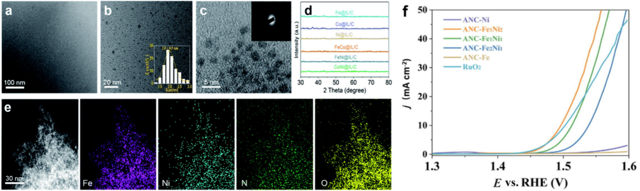 图三、FeNi@IL纳米颗粒的表征及M@IL/C催化剂电催化产氧反应活性测试