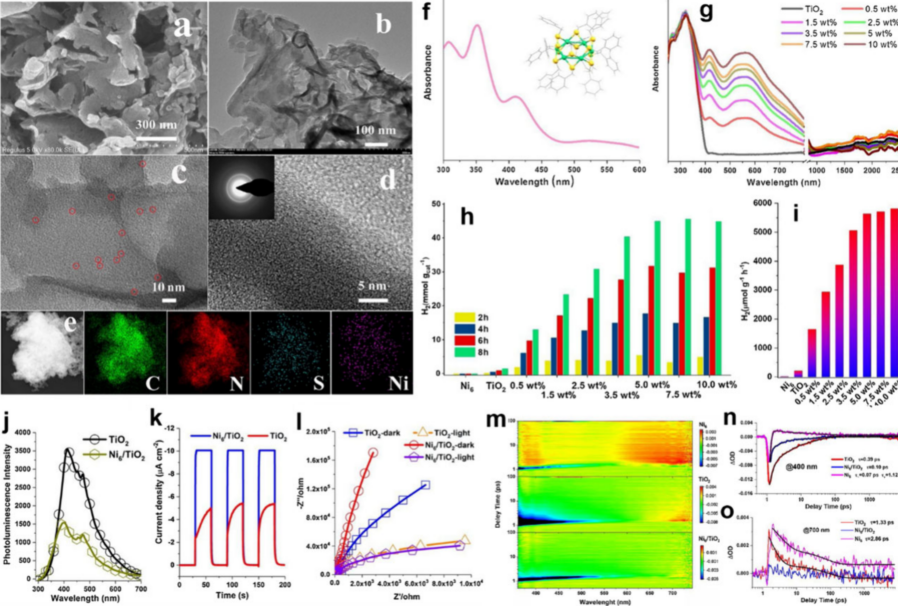 Ni6团簇能够负载并均匀分散于g-C3N4载体表面,TEM结果表明,负载后的Ni基团簇并没有发生明显的结构改变,EDS分析进一步证实了复合物结构的形成及元素分散的均一性。进一步研究表明,将Ni6负载于TiO2表面能够显著提高其光催化产氢的性能。