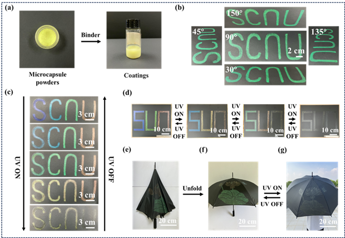 微胶囊结构保持了内部CLC微滴的三维螺旋结构,使得CLC微胶囊涂层的颜色不具有角度依赖性。该研究将CLC微胶囊与折射率匹配的粘合剂混合,制备了能够在不同柔性或刚性基材上大面积涂刷的光响应变色涂层,此涂层制备方法简单,操作灵活,具有宽视角特性、能够呈现出彩虹般的结构色,在美学装饰、仿生皮肤、比色传感器等领域有着广泛的应用价值。
