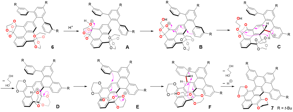近日,内蒙古大学朝鲁门研究员在Precision Chemistry上发表了通过半脱保护诱导环化反应合成交替扭曲纳米石墨烯的文章。作者通过半脱保护诱导的合成策略,实现了构象单一的扭曲纳米石墨烯的精准合成。即在中心芘核的K区域引入1,4-二氧六环来加固其构型稳定性。实验研究发现,无需氧化剂的条件下,前驱体环化过程中涉及四氧杂[4,4,4]桥环部分半脱保护诱导的新型C-C的键形成。并且作者提出了可能的反应机理(图2),反应起始于四氧杂[4.4.4]桥环单元(A)的质子化,引发C−O键断裂生成中间体(B),随后通过两次分子内Friedel-Crafts型环化及两分子乙二醇的逐步消除,最终实现目标产物7的高效合成。