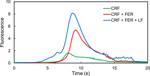 图3. 多重IAE提取后SPE整体柱的洗脱效果。IAE整体柱功能化修饰有抗CRF、抗铁蛋白和抗乳铁蛋白抗体。图示为生物标志物混合物经IAE/SPE串联提取后,SPE洗脱阶段的荧光检测信号。实验采用预标记的187.5 nM CRF、12.5 nM铁蛋白和6.3 nM乳铁蛋白混合样品。为更清晰比较不同实验批次,每个峰前50秒的基线数据已截除。