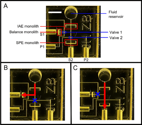 图1. 集成免疫亲和提取(IAE)/固相萃取(SPE)装置示意图。(A)装置结构特征。S1、S2:真空(抽吸)端口1和2;P1、P2:气动端口1和2。比例尺为3毫米。(B)设置为引导流体流经IAE和平衡整体柱的装置状态。向P2施加压力以关闭阀门2,同时通过S1施加真空抽吸。(C)设置为引导流体流经IAE和SPE整体柱的装置状态。通过P1施加压力关闭阀门1,同时通过S2施加真空抽吸。