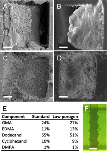 图2. 100μm×100μm通道中整体柱的优化。(A-D)在800倍放大率下拍摄的100μm×100μm通道内聚合整体柱的SEM显微照片,标尺为20μm。(A)IAE和(B)SPE整体柱采用针对50μm×50μm通道优化的配方制备,导致整体柱与通道壁粘附不完全。(C)使用低孔隙率单体混合物制备的IAE整体柱。(D)采用先前配方在锯齿状窗口内聚合的SPE整体柱。(E)IAE整体柱组成配比表。(F)锯齿状通道中SPE整体柱的显微照片,标尺为100μm。所有整体柱均在五通道测试装置(图S1)中完成聚合。