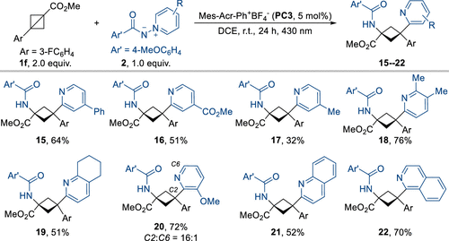 图2. 光致氧化还原催化双环[1.1.0]丁烷的区域及非对映选择性胺化-吡啶化