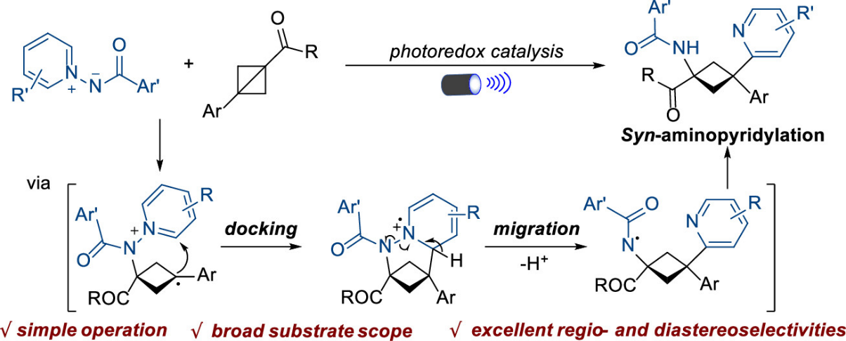 英文原题:Regio- and Diastereoselective Aminopyridylation of Bicyclo[1.1.0]butanes with N-Aminopyridinium Ylides Enabled by Photoredox Catalysis