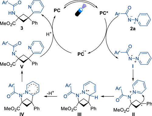接着,作者利用一系列控制实验(开关灯实验、荧光淬灭实验、自由基捕获实验及循环伏安法测反应物的氧化电势等)对反应的机理进行了深入研究,最终提出了反应的可能机理:激发态的光催化剂单电子氧化N-氨基吡啶鎓叶立德生成氮中心的自由基中间体I,该中间体选择性地加到BCB的酯基取代的一端生成苄基中间体II,然后中间体II依次经过分子内环化/脱质子/N-N键断裂过程得到新的氮中心自由基中间体V,最后中间体V依次经过单电子还原/质子化过程生成最终产物,并再生光催化剂,完成催化循环。